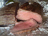 ○燃焼器具 七輪、自作チャコスタ (炭火) ○材料 牛肉ブロック 600g ニンニク 3かけ ローレル 2枚 塩 適量 荒挽きコショウ 適量 サラダ油 適量 ○作り方 1.牛肉ブロックの表面に、塩、荒挽きコショウをすり込みしばらく置いておきます。 2.プレヒートしたダッチオーブンにサラダ油を入れ 摩り下ろしたニンニクを入れて炒めます。 3.香ばしい香りがしてきたら牛肉ブロックを入れて 肉汁を封じ込めるように肉全体の表面をこんがりと焼き上げます。 4.焼き上がりましたら焦げ防止に網を敷き 再び牛肉ブロックを入れてローレルを加えてダッチの蓋をして 火力は下中火、上中火程度で約10〜15分位。 5.途中何度か焼き上がりの確認を鉄の串を刺して行います。 お肉に鉄串を刺して5秒、それを抜いて唇に当てて 冷たいと感じたらまだまだ、暖かいと感じたら焼き上がり。 熱いと感じたら、ただの肉の塊になっちゃうの焼き過ぎですので注意しましょう。(笑) 6.焼き上がったらアルミホイルに包んで冷めるのを待ちます。 熱いうちに包丁を入れると、美味しい肉汁が流れ出してしまうので 冷めるまで待ちましょう。 7.人肌に冷めたら完成です。 薄切りにして、ワサビしょう油かぽん酢等で召し上がると美味しいです。 ローストビーフは冷めても美味しいです。 ※ 牛肉ブロックは大きめのブロックで、スジの少ない物を選びましょう。 ケチって、安物を買うと食いちぎれませんよ!(笑) さて、今日はクリスマス・イブ。 スパークリングワインの良いつまみが出来ました。(笑)