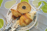 ○燃焼器具 七輪 炭火 ○材料 (下の写真の分量・・・大人4人でお茶するには十分) ホットケーキミックス 100g たまご Mサイズ 2個 砂糖 50g バター 50g 牛乳 20cc ○調理器具 15cm〜20cmサイズのボール 2個 泡だて器 1本 おたま 1本 (焼くときに棒に生地を付ける時に使用) アルミホイル 20cm角 2枚 (棒から外しやすくする為) φ20×900mm程度の木の丸棒 1本(100均で手に入る) 小さな鍋 1 (バターを溶かす為) ○作り方 1.2つ用意したボールのひとつに卵の卵黄だけを入れて、もうひとつのボールには卵の卵白を分けて入れます。 2.先ずは卵黄を泡立てて、砂糖を入れてよく混ぜます。 そして溶かしたバターを追加して更によく混ぜます。 牛乳を加えてホットケーキミックスを数回に分けて入れて、またまたよく混ぜます。 3.次に卵白の入ったボールに移り、卵白を泡立てます。(メレンゲ作り) これが一番大変な作業です。(笑) 4.メレンゲが出来たら、ホットケーキミックスを入れたボールに入れて更によく混ぜます。 これで生地の出来あがりです。 5.丸棒の先端にアルミホイルを巻きつけて、生地をからませます。 炭火に近づけて棒をクルクル回しながらキツネ色になるまで焼きます。 そしてまた生地をからませて焼く・・・その繰り返しで太くなっていきます。 約10回程度で下の写真の年輪に・・・。 あまり太くすると持っている腕が疲れます。(笑) ※ 焼き方のコツ 一番最初に生地をからめる時は出来るだけ薄くして 生地を乾かすつもりで棒になじませます。 二回目からは生地をからませたら 生地がたれないように早めに棒を回します。 表面が乾いたらゆっくり回してキツネ色に仕上げましょう。 焼きあがったらアルミホイルごと棒から簡単に外れますので お好みの厚さに切ってお召上がり下さい。 簡単にバウムクーヘンが作れますのでお勧めですよ。(笑) ![]() 2007.03.10 |
