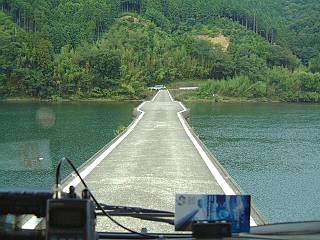 PM0:25 昼食を済ませて出発。国道33、494、56、381号を利用して、四万十川を目指す。途中、窪川にて食料調達。道の駅「四万十大正」にて休憩。道の駅下の四万十川に足だけ入ってみる。冷たくない!気温35度もある為、川の水も猛暑には勝てないようだ。(海の方が冷たい。)道の駅を出発して、四万十川沿いに南下する。国道441は道が狭い。神経も磨り減り、通過に時間が掛かる。(小型車どうしのすれ違い困難、待避所はあるがカーブミラーが無いので怖い)途中、有名な沈下橋をキャンピングカーで渡ってみました。(橋の幅が4Mくらい)かなり怖いです。