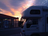 22:46 途中「吉田IC」付近で事後渋滞があったが無事に「牧之原SA」着。キャンカーの泊まり客は、我が家とトラベルトレーラー1台だけ。一杯飲んで寝る。