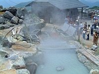 湧き出ている温泉池。約80℃あるそうです。温泉池の中で黒玉子を10分〜15分ゆでて、さらに温泉池から出して5分ほど大きな箱で蒸したら出来上がりです。 |