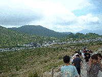 湯釜よりレストハウス駐車場を望む。「湯釜」には草津白根レストハウスの駐車場からのアクセス。写真では解かりにくいですが、最後の登りで歳を感じます。アハハ。 |