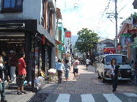 「旧軽井沢銀座」入口。いろんなお店が建ち並んでいるが、横浜でも買える物が大半を占めてますね。なので、珍しいお店はやはり混み合っていました。 |