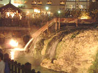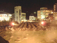 「湯畑」夜はライトアップされて、昼間とは違った印象です。 |