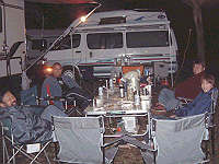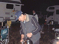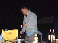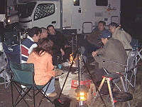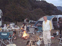 日が暮れてくると気温も下がり焚火の側にメンバーが集まってきます。手前は「シリウスさん」。 |
