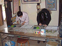 最初に「何か葉っぱを見つけて来て下さい」と言われます。自分で探してきた葉っぱに染料を塗ってハンカチなどにのせて、葉っぱについた染料を生地に摺り込みます。写真左が私、で隣りは長女です。 |