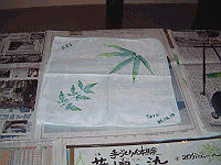 誰でも簡単に出来ますが、後はセンスの問題です。ハハハ。(笑) 写真はもちろん私が作りました。体験料、ハンカチ1枚400円。 |