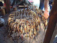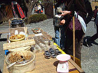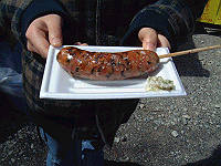 「ふる里」で焼いて売っているソーセージも美味いです。黒豚の手作りソーセージ、中には竹の子も入っています。1本300円。 |