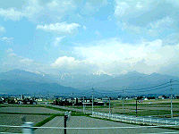 長野道を北上すると、左手に山頂付近がまだまだ真っ白な山々が望めます。 |