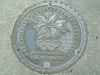 温泉街の狭い道路にはこんなマンホールの蓋も・・・1998年の長野オリンピックの物。 |