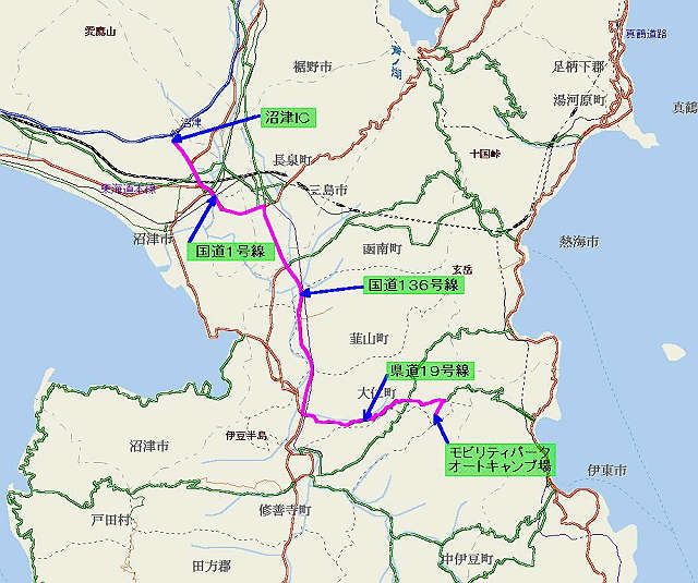 足柄SA → 東名高速 → 沼津IC → 国道1号 → 国道136号 → 県道19号 → モビリティパークオートキャンプ場(泊)