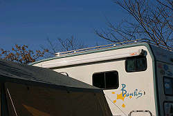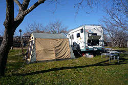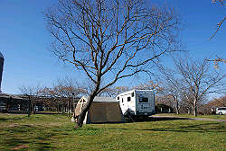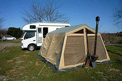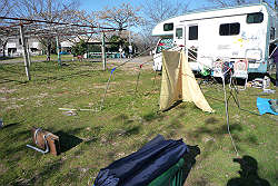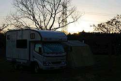 強風の中、キャンピングカーを風除けに無事設営完了! |