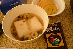 で、「簡単お雑煮」・・・インスタントのお吸いものに御餅と鳴門巻きを足せばお雑煮もどき?が完成。