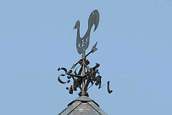 町営駐車場のトイレの建物の上の風見鶏。 |