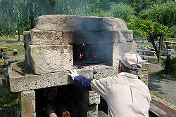 鉄のトレーに載せて焼いていきますが、釜の前はメチャ熱いです。