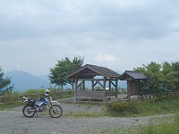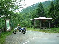 「黒野田林道」唯一の東屋。この林道は全面舗装だが所々落石が有り石を避けながらの走行で景色を楽しむ暇なしでした。 |