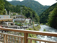 梅ヶ島温泉街。と、いっても10軒程度が立ち並ぶ小さな温泉街。この橋の右手に以前は市営の入浴施設があったようです。 |