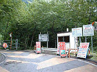 楽しみにしていた「安部峠」へ向かう「梅ヶ島林道」の静岡県側入口。崖崩れにより通行止め。話によると山梨県側は峠まで通行可能とのこと。 |
