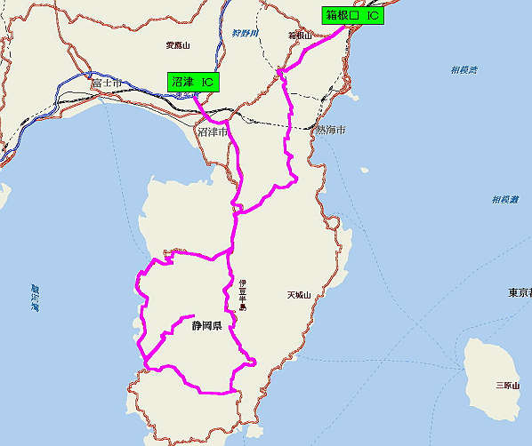 自宅 → 横浜町田IC → 東名高速 → 沼津IC → R1 → R136 → 修善寺 → R136 → 土肥 → R136 → 堂ヶ島(田沢公園露天風呂) → R136 → 松崎 → 県道15号 → 道の駅「花の三聖苑伊豆松崎」(かじかの湯) → 県道15号 → R136 → 県道59号(通行止めでピストン) → R136 → 県道15号 → R414 → 天城トンネル → R414 → R136 → 修善寺 → 県道80号 → 県道19号 → 亀石峠IC → 伊豆スカイライン → 熱海峠IC → 県道20号 → 箱根峠 → 箱根新道 → 小田原厚木道路 → 厚木IC → 東名高速 → 横浜町田IC → 自宅