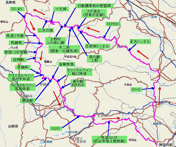 自宅 → R16 → 入間市 → R299 → 正丸トンネル → R299 → 秩父市 → R299 → 志賀坂トンネル → R299 → 道の駅「上野」 → R299 → 不二洞 → R299 → 十石峠 → R299 → 佐久穂町 → R141 → 小海 → 県道2号 → 馬越峠 → 県道2号 → 県道68号 → 県道106号 → 信州峠 → 県道106号 → クリスタルライン → 木賊峠 → クリスタルライン → 焼山峠 → クリスタルライン → 金峰牧場 → クリスタルライン → R140 → 道の駅「まきおか」 → R140 → 県道38号 → R20 → 大月 → R139 → 都留市 → 県道35号 → 県道517号 → 県道518号 → 県道64号 → 県道60号 → R246 → 自宅
