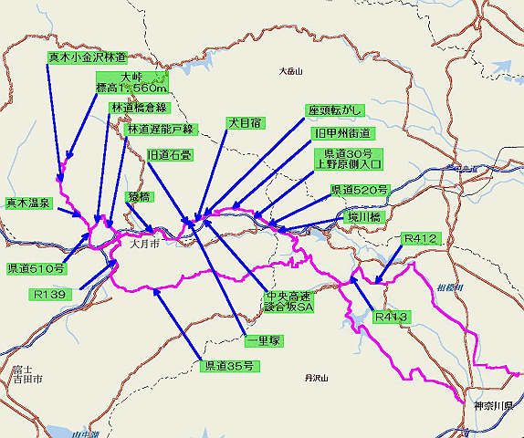 自宅 → R246 → 厚木市 → 県道60号、64号、518号、520号 → 上野原町 → R20 → 旧甲州街道(県道30号線) → 大月市 → R20 → 県道510号 → 真木小金沢林道 → 大峠 → 真木小金沢林道 → 真木温泉 → 林道橋倉線 → 林道遅能戸線 → 大月駅 → R139 → 都留市 → 県道35号 → 県道517号 → 県道518号 → R413 → 県道510号 → 県道511 → 県道42号 → R246 → 自宅