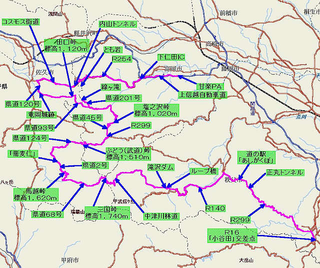 自宅 → R16 → 入間IC → 圏央道 → 鶴ヶ島JCT → 関越自動車道 → 藤岡JCT → 上信越自動車道 → 甘楽PA → 下仁田IC → R254 → 佐久市 → 県道120号 → 竜岡城跡(五稜郭) → 県道93号 → 田口峠 → 県道201号 → 線ヶ滝 → 県道93号、45号 → 塩之沢峠 → R299 → 県道124号 → ぶどう(武道)峠 → 県道2号 → 「蕎麦仁」 → 馬越峠 → 県道68号 → 三国峠 → 中津川林道 → 県道210号 → R140 → 秩父 → R299 → 道の駅「あしがくぼ」 → 正丸トンネル → R299 → R16 → 自宅
