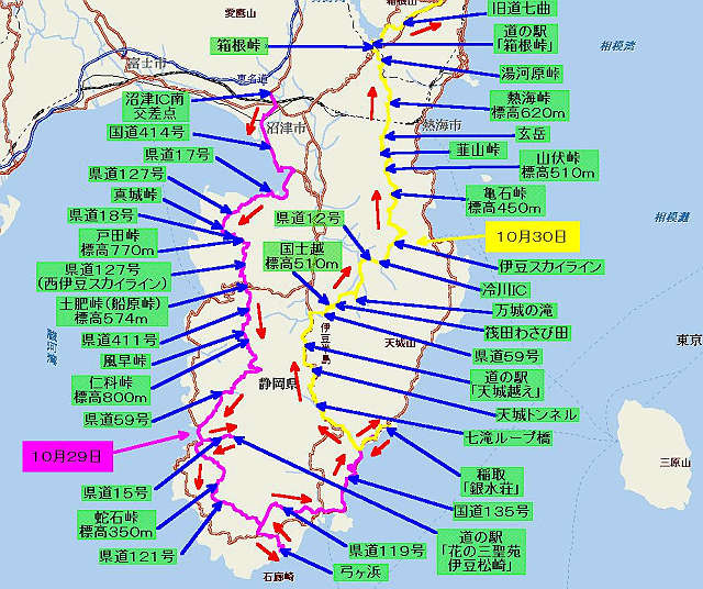 稲取「銀水荘」 → 国道135号 → 河津 → 県道14号 → 国道414号 → 七滝ループ橋 → 天城トンネル → 道の駅「天城越え」 → 湯ヶ島 → 県道59号 → 国士越 → わさび田 → 万城の滝 → 県道12号 → 冷川IC → 伊豆スカイライン → 熱海峠 → 県道20号 → 箱根峠 → 国道1号 → 道の駅「箱根峠」 → 旧道七曲 → 箱根口IC → 小田原厚木道路 → 厚木IC → 東名高速道路 → 横浜町田IC → 自宅