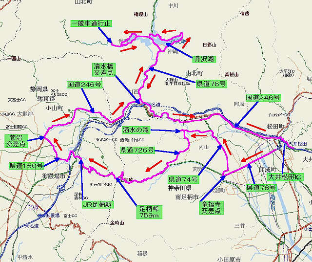 自宅 → 横浜町田IC → 東名高速 → 大井松田IC → 県道78号 → 竜福寺交差点 → 県道74号 → 酒水の滝 → 県道726号 → 県道78号 → 足柄峠 → 県道78号 → JR足柄駅 → 県道150号 → 菅沼交差点 → 国道246号 → 清水橋交差点 → 県道76号 → 丹沢湖 → 県道76号 → 国道246号 → 県道77号 → 県道62号 → 小田厚側道 → 厚木 → 国道246号 → 自宅