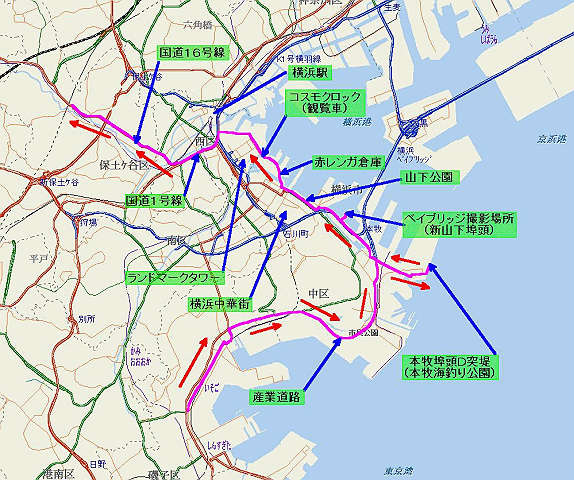 自宅 → 保土ケ谷バイパス(国道16号) → 環状2号線(県道17号) → 磯子 → 産業道路 → 本牧埠頭 → みなとみらい21 → 国道1号 → 国道16号 → 自宅