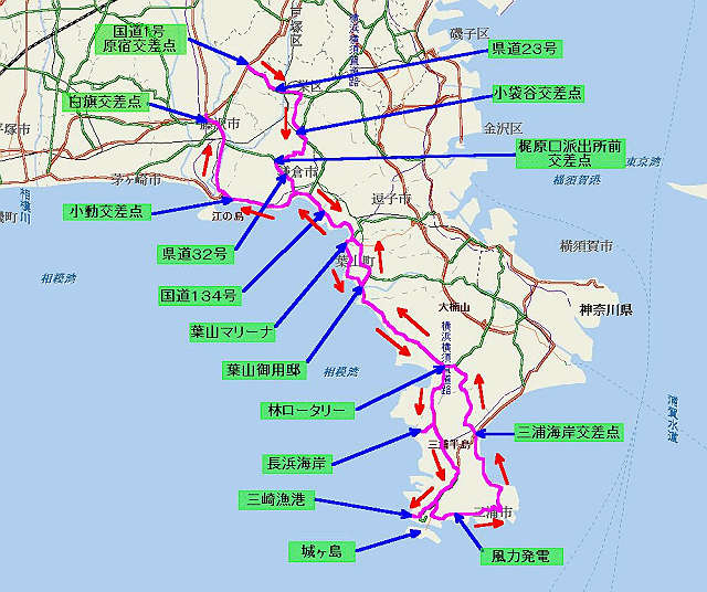 自宅 → 原宿交差点(国道1号) → 県道23号 → 県道32号 → 国道134号 → 長浜海岸 → 三崎漁港 → 三浦海岸 → 国道134号 → 白旗交差点(国道1号) → 自宅