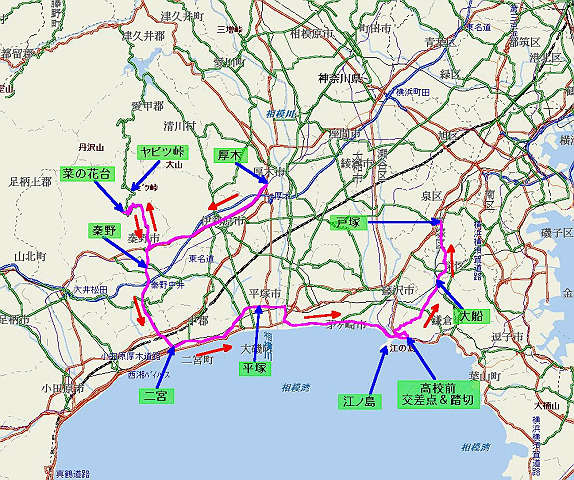 自宅 → 国道246号 → 秦野 → 県道70号 → 「菜の花台」 → 県道70号 → 秦野 → 県道71号 → 二宮 → 行動1号 → 平塚 → 国道134号 → 江ノ島 → 七里ガ浜 → 県道304号 → 大船 → 県道203号 → 戸塚 → 自宅