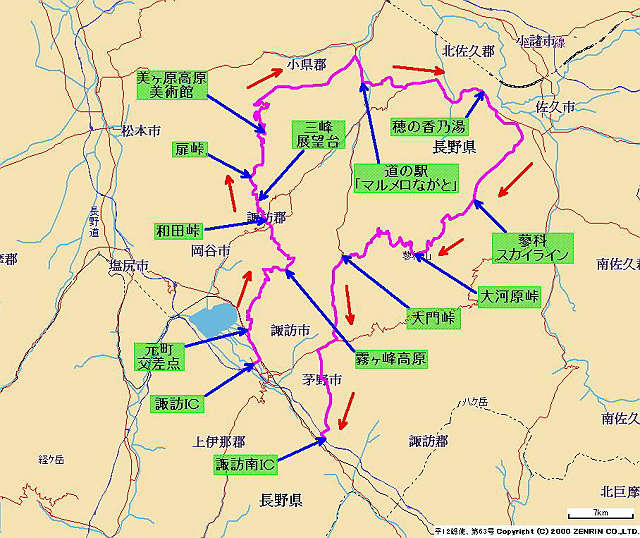 自宅 → 国道246号 → 宮ヶ瀬湖経由 → 上野原IC → 中央高速 → 諏訪IC → 国道20号 → 元町交差点 → 県道40号 → ビーナスライン → 県道464号、62号 → 国道152号 → 道の駅「マルメロながと」 → 国道254 → 相浜交差点 → 県道145号 → 蓼科スカイライン → 県道40号 → 国道152号 → 県道17号経由 → 南諏訪IC → 中央高速 → 上野原IC → 宮ヶ瀬湖経由 → 国道246 → 自宅