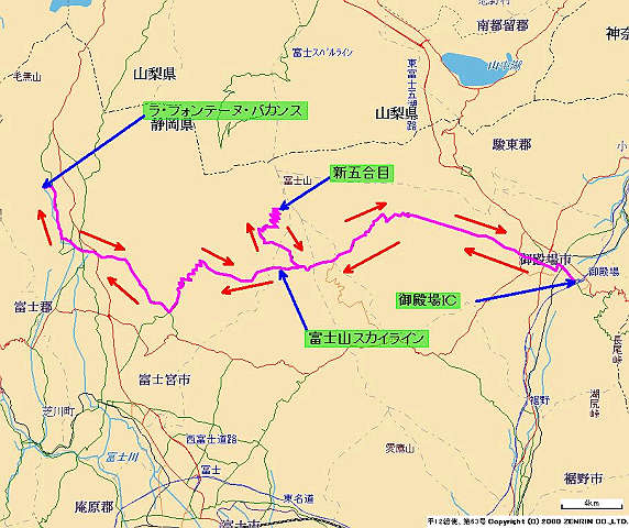 自宅 → 国道246号 → 厚木IC → 東名高速 → 御殿場IC → 県道23号 → 富士山スカイライン → 新五合目 → 富士山スカイライン → 県道72号、414号 → 「ラ・フォンテーヌ・バカンス」 → 国道141、72号 → 富士山スカイライン → 県道23号 → 御殿場IC → 東名高速 → 横浜町田IC → 自宅
