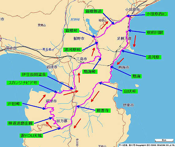 自宅 → 国道246号 → 厚木 → 小田原厚木道路 → 小田原 → 国道135号 → 熱海 → 下多賀交差点 → 県道80号 → 山伏峠 → 県道80号 → 修善寺 → 国道136号 → 林道達磨山線 → だるま山高原 → 県道18号 → 戸田峠 → 林道瀬戸川線 → 県道17号 → 伊豆長岡温泉 → 県道11号 → 熱海峠 → 県道20号 → 箱根峠 → 箱根新道 → 小田原厚木道路 → 国道246 → 自宅