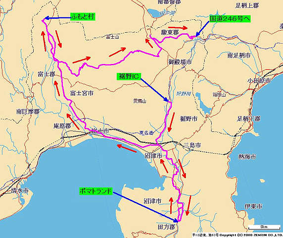 自宅 → 横浜町田IC → 東名高速 → 裾野IC → 国道246号、1号、136号 → 「修善寺ポマトランド」 → 国道136号、1号 → 東富士交差点 → 国道139号 → 「富士オートキャンプ場ふもと村」 → 国道139号 → 県道72号、180号、23号 → 国道246号 → 自宅
