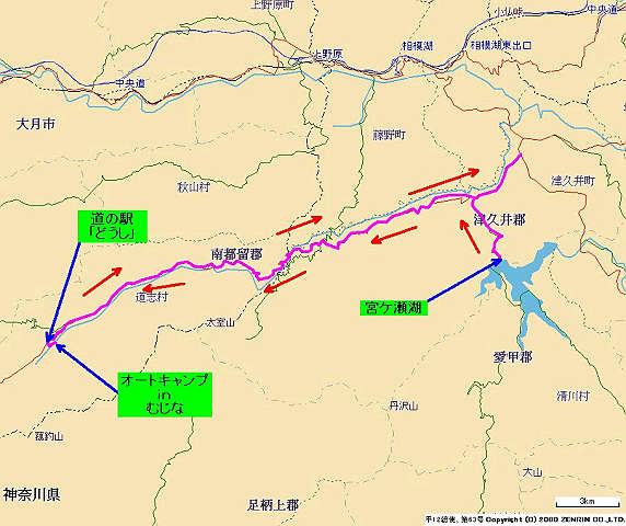 自宅 → 国道246号 → 厚木 → 県道60号、64号 → 宮ケ瀬湖 → 県道64号 → 国道413号 → 道の駅「どうし」 → オートキャンプ in むじな(泊)