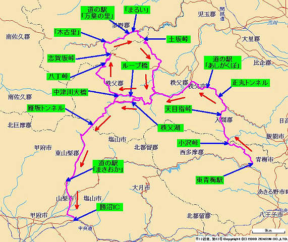 自宅 → 横浜町田IC付近(第一集合場所) → 国道16号 → 八王子バイパス → 国道16号 → 県道29号 → 青梅 → 県道28号、53号、395号 → 国道299号 → 道の駅「あしがくぼ」(第二集合場所) → 国道299号、140号 → 秩父湖 → 国道140号 → 中津川大橋 → 県道210号 → 金山志賀坂林道 → 八丁峠 → 金山志賀坂林道 → 志賀坂峠 → 国道299号 → 木古里 → 国道462号 → 道の駅「万葉の里」 → 「まるい」 → 県道71号、37号 → 「黒海土バイパス前」交差点で解散 → 県道37号 → 国道140号 → 雁坂トンネル → 道の駅「まきおか」 → 県道38号 → 国道411号 → 国道20号 → 勝沼IC → 中央自動車道 → 上野原IC → 県道76号、518号、64号 → 宮ケ瀬湖 → 国道412 → 国道246 → 自宅