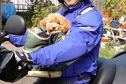 | 前抱っこキャリーにワンコを乗せて出発! |