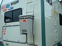 以前のキャンカーで利用していたラダーに取り付けるゴミ箱。以前のキャンカーよりラダーの幅が狭くなり、取付金具の位置を変更して取り付け完了。