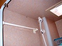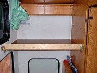 突っ張り棚の取り付け。これも以前のキャンカーの物を流用。しかしサイズが合わず、100ミリほどカットして取り付けた。