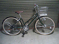ちょっとヨーロピアン調の自転車。ブリジストンの「サブナードスポーツ(NSS66T)」。 色はメタリックのグラッシーグリーン。グリップとサドルが茶色でお洒落です。(笑) 外装6段変速で坂道も楽々かな?最近流行り?のハブダイナモ付。