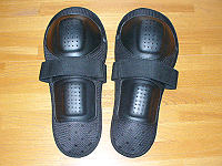 で、品物はひざとすねを守る「ニーシンガード」。軽量コンパクトなのでジーンズのインナーにも装着可能な物。一本ベルト固定なので上手く固定できるのかと思ったら意外とずれない。