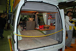 「このベットをあの車に付けて、あのトイレルームをここに設置して、キッチンはあそこの車・・・」