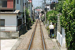 こちらは玄関先か裏口かは不明だが、家から出て線路の脇を平然と歩く地元の人・・・事故が起きないのが不思議、ちょっと怖い気もする。 |