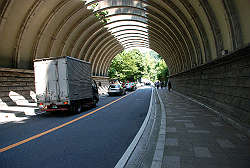 道路の真ん中を走る風景。 |