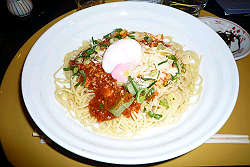 メインは「湯葉と生麩とモッツァレラチーズのミートソース温泉卵添え」・・・ちょっとタイトル長くて言いにくいから指差して「コレ!」で注文。 美味いか?と聞かれても複雑な味なので説明し難い。 トータル的に一度食べたら、もういいかも?程度。 他の種類はもっと美味しいのかもしれないけどね。